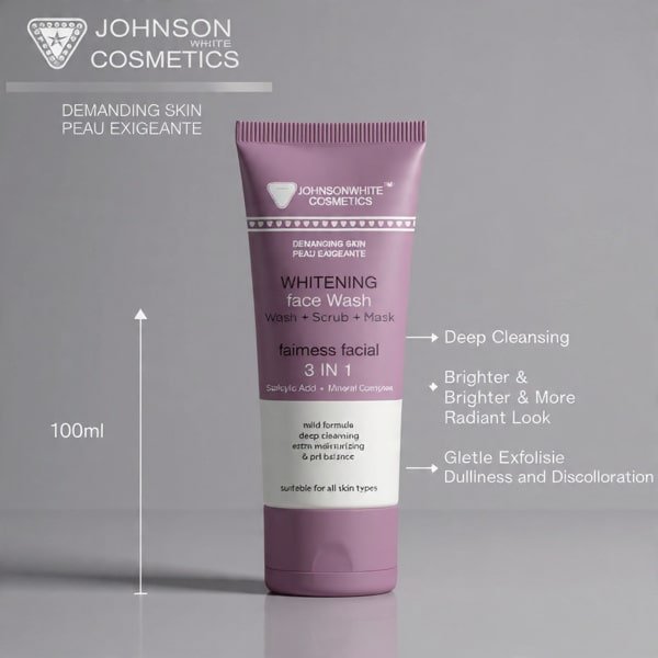 Johnson White Cosmetics Whitening Face Wash 3in1 is a powerful skincare solution designed to deeply cleanse, brighten, and rejuvenate your skin. Its advanced formula combines gentle cleansing agents, natural brightening extracts, and nourishing ingredients to remove dirt, oil, and impurities while promoting an even and radiant complexion. Suitable for all skin types, this 3in1 face wash helps maintain fresh, glowing skin every day.
